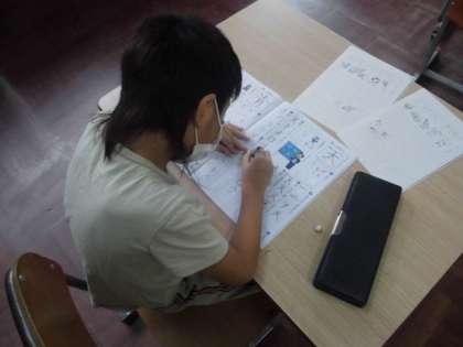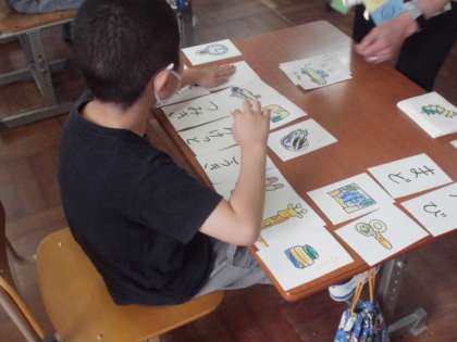 文字の学習では,カタカナのプリントや漢字の学習ノートを使って練習しています。また,カルタを使って絵と言葉をつなげるような学習にも取り組んでいます。だんだんやり方にも慣れてきているようでした。