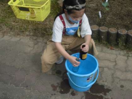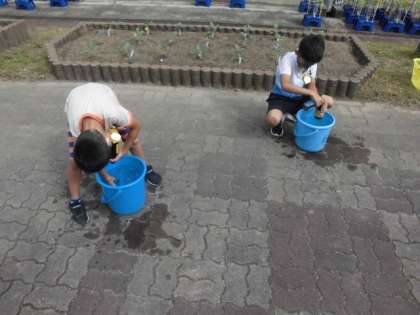 算数では,ちがう容器に水を入れた時,どちらの方がたくさん入るか考えました。実際に大きいなと自分が思う方に水を入れて移し替えることにしました。すると,だんだん水が溜まってあふれてしまいました。どうやら始めに水を入れた容器の方が大きいということが分かりました。