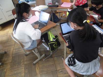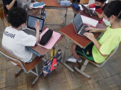 総合的な学習の時間には,学校の北側を流れる有栖川を守るためにできることを調べました。各自,タブレットを使って,昔と今の様子や生き物の様子などテーマに分かれて調べました。これから地球温暖化のことも調べ,環境を守るために自分たちにできることを考えていきます。