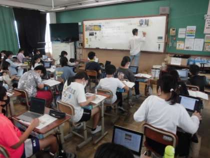 理科の時間には,地面のしま模様がどのようにしてできるのか調べました。川の流れによって削られた砂や土が溜まってできるとか火山の噴火によってできるなどの予想が出ました。予想をもとに各自タブレットで調べました。最後にタブレットを使って学習の振り返りを提出することにも慣れてきました。