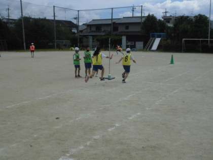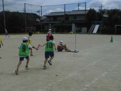 体育では,リレーに取り組んでいます。個人の走力を高めることとともに「バトンパス」の仕方に着目して取り組んでいます。できるだけスピードを落とさないように受渡しができるように走順やスタート位置を工夫しています。チーム全体のタイムを縮めるために練習していきます。
