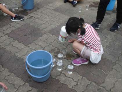 算数の時間には,おうちから持って来たいろんな入れ物に水を入れて,「かさ」をくらべました。大きな入れ物も小さな入れ物もどれくらい入るか,同じ大きさのコップ何杯分という形で量りました。そうすることで,どのくらい多いのか少ないのか理解していました。