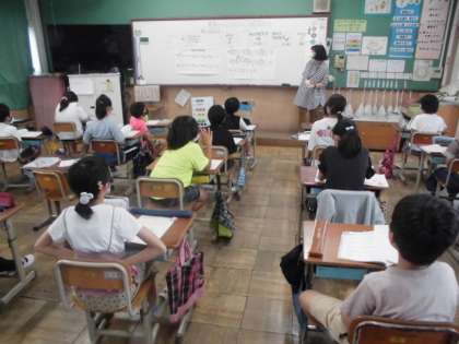 音楽の時間には,緊急事態宣言中のために合唱ができません。今日は,「ゆかいに歩けば」という曲を聞きながら旋律の特徴をつかみました。スタッカートという記号がついていると弾んだように演奏したり,p(ピアノ)やmp(メッゾピアノ)といった記号を見ながら強弱をつけて演奏したりすることが分かりました。