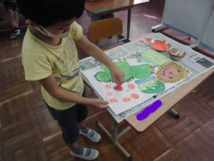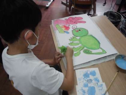図工の時間には,お話の絵の背景を描きました。自分の好きな色を1つ選び,タンポを使って塗っていきました。どこにどれくらい色を置くのか考えながら。塗っていました。
