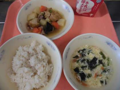 子供たちから,「『豚肉と野菜の煮つけ』は,じゃがいもがホクホクでやわらかくて,厚揚げにも味がしみこんでいて,おいしかったです。『かきたま汁』は,ほうれん草とにんじん・卵の色合いもきれいでおいしかったです。」と,感想をくれました。