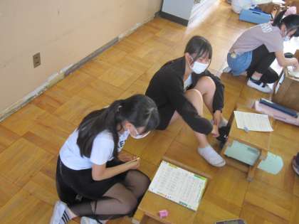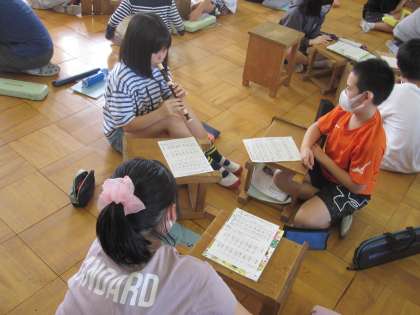 階名で歌ったり,リコーダーなどで演奏したりして,試しながらつくっています。「同じ音でつなげよう,違う音にしようか。」「音の高さがだんだん上がっていくようにしよう。」など,グループで相談しながら音を決めていきました。