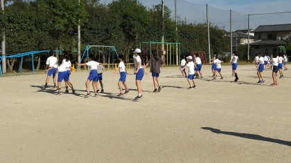 今日は運動場で,踊るときの隊形を確認しながら踊りました。