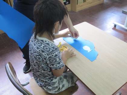 自分のつくりたいお話に合わせて,動かすものを折り紙や色画用紙などを使って手作りします。背景も色画用紙などで作る子もいて,細かな場面作りができています。