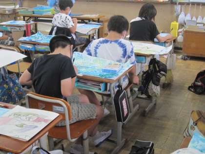 手前と奥の遠近感を表現するためには,手前は濃く,奥は薄くして,色の濃淡をつけるとよいことを確認し,自分の絵では,どう表現したらよいか確かめながら,少しずつ色付けをしていきました。
