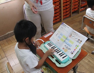 1年生の音楽科では,けんばんハーモニカを使って,ドレミファソを演奏しています。