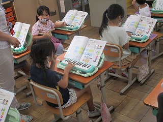 ミファソ,レミファなど指示のあった音を三音ずつ,指の番号に気を付けながら音を出していました。今は一人ずつでの演奏ですが,友達の演奏もしっかりと聞いていました。