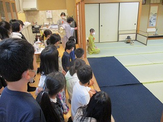 今日は茶道の先生に来ていただき,1組の子どもたちが体験をしました。まずは,「席入り」です。お辞儀の仕方,歩き方など,先生のお手本をよく見て,席についていきます。子どもたちは緊張しながらも,作法を守ってお辞儀や移動をしていました。席に着いた時は,みんなホッとしているようでした。