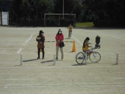 3・4時間目に自転車教室がありました。運動場に設置された道を使って交通安全に気をつけながら自転車の運転をしました。スタートではどんなことに気をつけるのか,一時停止の標識があるとどうするのか,教えてもらったことを思い出しながら運転していました。これからの生活に生かしてほしいと思います。