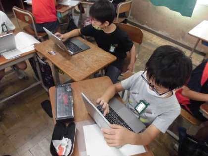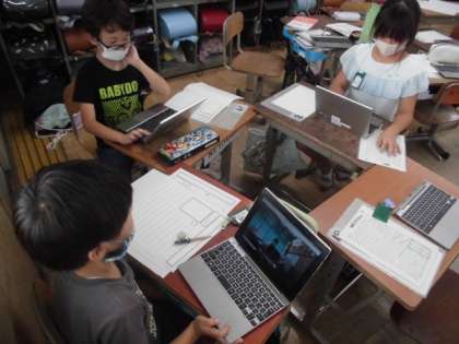 総合的な学習の時間には,タブレットを使って梅北の自慢を紹介する資料を作りました。どんなことが自慢なのか考え,テーマごとに調べたり必要な写真を撮りに行ったりしました。撮影した写真に文字を入力したり順番を考えてつなげたりしました。