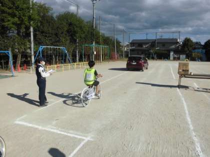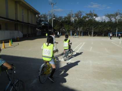 5年生も午後から自転車教室をしました。設定された細い道をゆっくり走ったり車をよけながら走ったりしました。安全に運転するためには,ハンドル操作だけでなく,周りを安全を確認したり標識を守ったりすることも大切だと分かりました。これから普段の生活でも安全に気をつけて過ごしてほしいと思います。