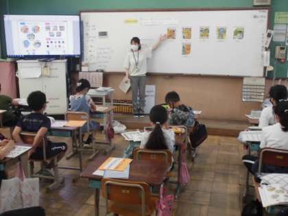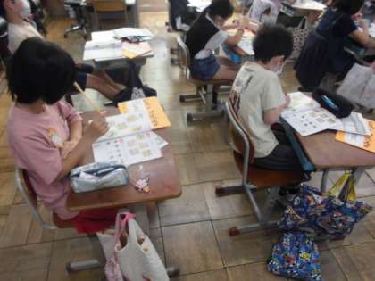 今日の外国語活動では,アルファベットのヒントをもとに教科書から挿絵を探しました。アルファベットの発音を何度も聞いて,どんな文字が隠されているか考えていました。2つの言葉を組み合わせていることもありましたが,ヒントをよく聞いて答えを見つけていました。