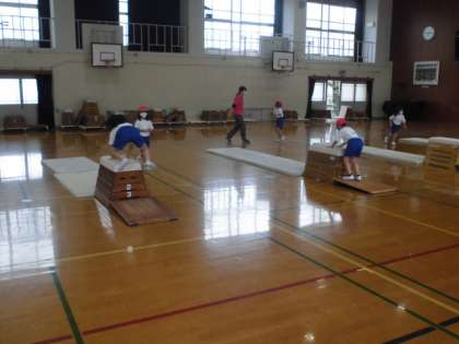 体育の時間には,とびばこあそびをしました。自分に合った高さでとび箱の上に乗ったり跳び越えたりしました。踏切板を上手に使いながら,リズムよくジャンプしていました。安全のために着地にも気をつけていました。