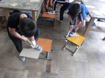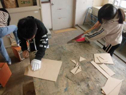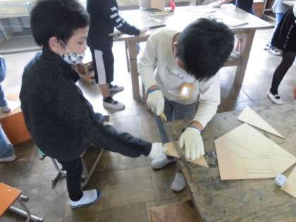 図工の時間には,のこぎりを使って木を切りました。1枚の板に引いた線をもとにいろんな四角形や三角形に切っていきました。あまり使ったことがないので,まっすぐ切ることに苦労していましたが,のこぎりをゆっくり引くようにすると,スムーズに切れることに気づいていました。