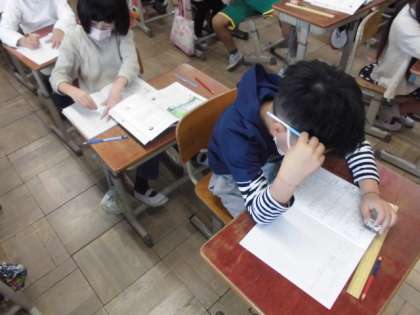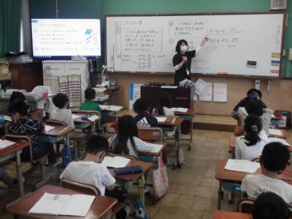 あひるが17羽いるところへ6羽やってきて,さらに4羽やってきました。あひるは全部で何羽になったのか求める時,17+6+4というふうに順番に計算する方法もありますが,今日は,後からやってきたあひるだけまとめて計算する方法を学習しました。式の中に( )を使うことで先に計算できることが分かりました。