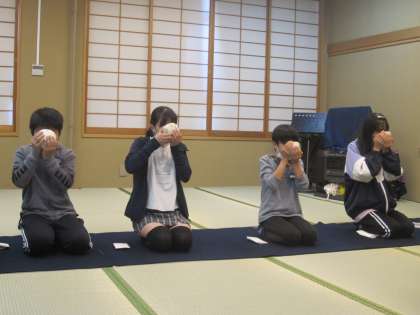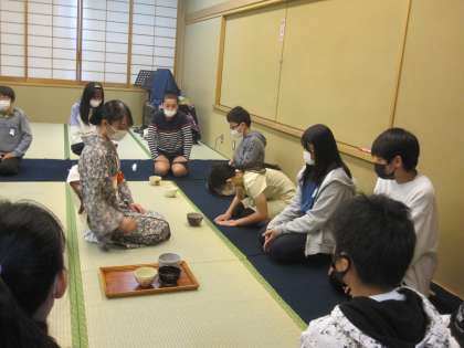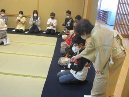 日頃,正座で座ることがあまりない子も多いようですが,静かなお茶室の中で,いつもとは違う雰囲気をじっくり味わっていました。