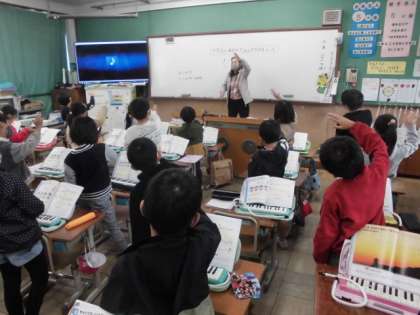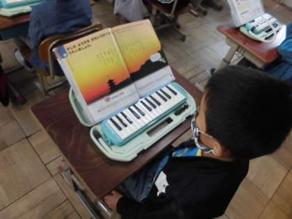 音楽の時間には,「夕やけこやけ」の歌詞から様子を思い浮かべました。今まで見たことのある真っ赤な空を思い出しながら曲に合わせて口ずさみました。その後,「かねがなる」という曲に合わせて,音の強弱を手で表現しながら繰り返される曲調を楽しんでいました。