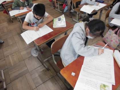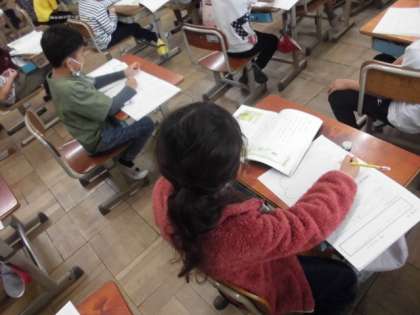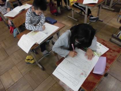 国語の時間には「お手紙」というお話を学習しています。今日は,お話の中で自分が好きな場面を選んで音読メモを書きました。「最後の音を伸ばす」という読み方の工夫や「首をかしげる」といった仕草など,自分がふさわしいと思った読み方と動作についてメモしました。