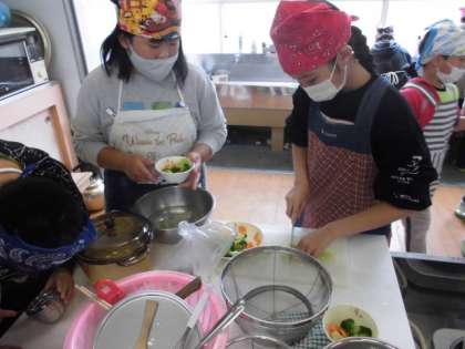 家庭科の時間には,ごはんとゆで野菜のサラダを作りました。サラダには,キャベツ,にんじん,ブロッコリーを入れます。それぞれ切り方やゆでる時間が違うので,説明をよく見て進めていきました。サラダにかけるソースも自分たちで作った後,ゆでた野菜を彩りよく盛り付けていました。