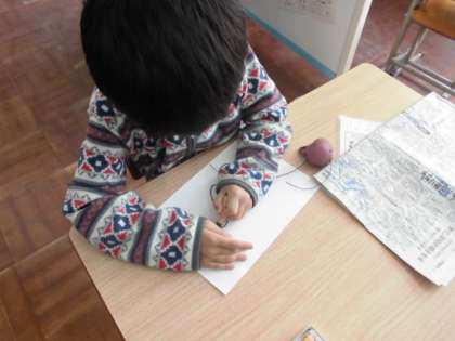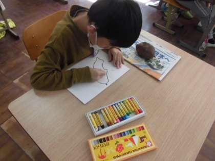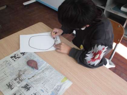 クラスの前で育てていたサツマイモを収穫しました。いろんな形のサツマイモがとれたので,今日は,自分の選んだサツマイモの絵を描くことにしました。形や大きさをよく見て,ゆっくり丁寧に線を描いていました。