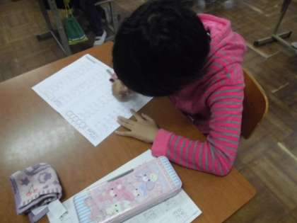 算数の時間には,自分の課題に合ったプリントに取り組みました。2ケタのたし算や体積などそれぞれに応じたプリントに集中していました。計算の方法に迷った時は,数図ブロックを使って計算するようにしていました。