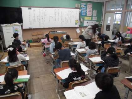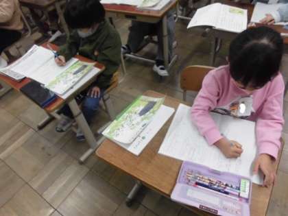 がまくんはすわっていました。という文で「がまくんは」がしゅ語で「すわっていました」がじゅつ語になります。今日の国語では,「〜が(は)」がしゅ語,「どうする」の部分がじゅつ語になることを学習し,見つけたしゅ語には赤でじゅつ語には青で線を引きました。いろんな文について考えると,だんだん見分け方が分かってきているようでした。