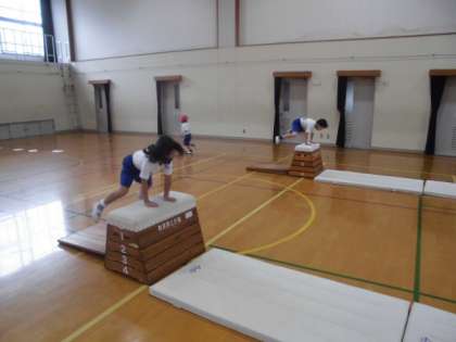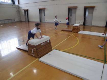 体育の時間には,とびばこあそびの学習をしました。今日は,跳び箱を跳び越す技を知りました。足を広げて跳んだり横向きに跳び越えたりしました。自分のできそうな高さのとび箱に何度も挑戦していました。