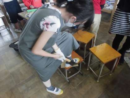 図工の時間には,のこぎりを使って板を切っています。自分が引いたいろんな線に沿ってのこぎりをギコギコ動かしながら切っていきます。始めはうまく切れなかったけれど,何回か切っているうちに,のこぎりの角度や力加減が分かってきました。切れた板にやすりをかけてから,イメージに合う色を絵の具で塗っていきました。