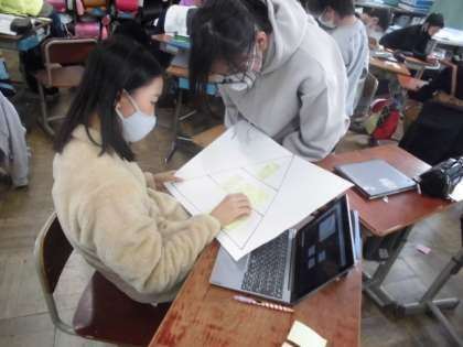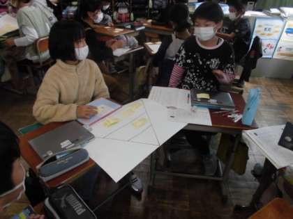 国語の時間には,考えを広げたりまとめたりする話し合いとはどんな話し合いか確認した後,学校をよりよくするためにどんなことが必要か話し合いました。各自の意見を書いた付せんを1つにまとめてから話し合っていきました。