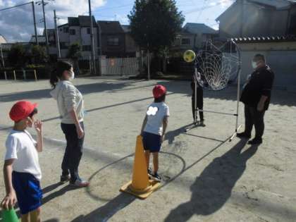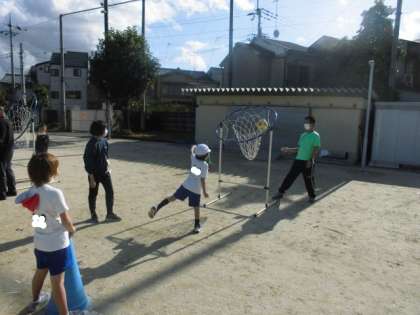 体育の時間には,的に向かってボールを投げました。大きめのゴールを狙って投げますが,距離感が難しそうでした。上から投げたり下から投げたり両手で投げたりといろんな投げ方で挑戦しました。うまく的に入ると,嬉しそうでした。