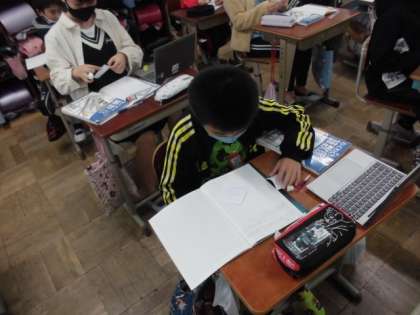 長方形や正方形,三角形の面積を求める公式は学習しました。今日は,辺の長さが違う四角形や五角形の面積をどうやって求めればいいか考えました。三角形や長方形のような新たな公式があるわけでもないので,学習したことを使えるように工夫しました。