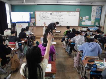 算数では,比例の学習をしています。未知の数をXやYで表し,関係を式にしています。今日は,列車の走った時間と道のりについて表したグラフをもとに,時間や道のりを読み取りました。横軸と縦軸に表されたものが何か間違えないように単位に気をつけて読むようにしていました。