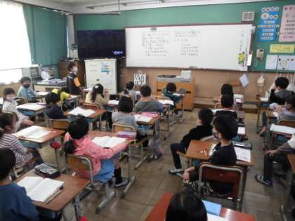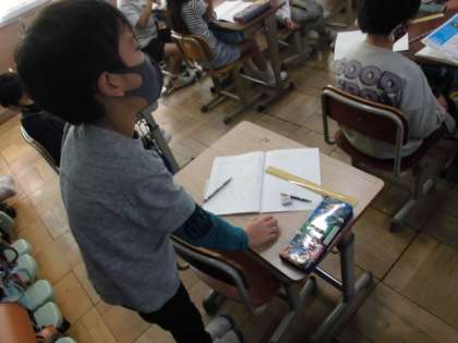 今日の算数では,高さ5cmの箱を4個積むと,何センチメートルになるのか考えました。5を4つ分足す方法でもできますが,昨日学習したかけ算を使うことにしました。5cmの4つ分だから「5×4」と式を立てていました。