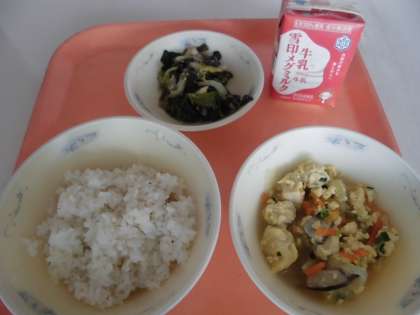 子供たちから,「『高野どうふの卵とじ』は,いろいろな食感があってとってもおいしかったです。『ほうれん草とはくさいのごま煮』は,ごまも入っていて,おいしかったです。」と,感想をくれました。