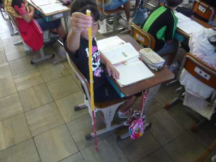 算数科では,具体的な操作をしながら自分で問題を解決しその答えの根拠を立てて説明する学習を繰り返しています。「面積」の学習では,実際に運動場の面積を測ったり1平方センチメートルをつなげて1メートルの長さを作ったりして,視覚的に具体物を見て頭の中でイメージしながら学習を進めてきました。今後も単元の学習を振り返りながら,単位が変わってもそれぞれの面積がどのくらいの大きさかを想像して,課題を自力解決できるように学習を進めていきたいと思います。