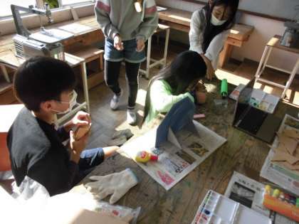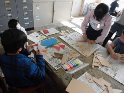 ギコギコ ギコギコとのこぎりを使って板を切ることにもだんだん慣れてきました。始めに切り込みを入れることや引く時に力を入れることなど,少しずつコツが分かってきたようで,スムーズにのこぎりを動かすことができていました。切り取った板に着色ができたら組み立てていきます。