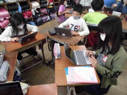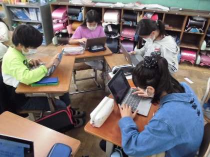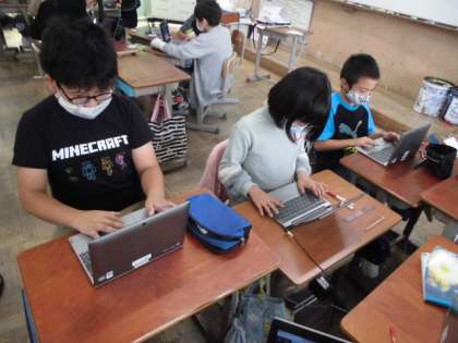 クラスや学校をもっとよくするためにどうすればいいか話し合い,会社を立ち上げることになりました。このような社会状況なので,マスクをつけるように声をかける会社や学校のルールを守るように声をかける会社など,グループごとに考えていました。ロイロノートを使ってみんなの意見を整理することで,どんなことをどんな場所でがんばればいいか見えてきました。