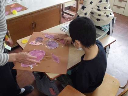 前の時間に自分の描いたサツマイモの絵を切り取りました。今日は,茶色の色画用紙の上に配置を考えてのりで貼っていきました。大きさやバランスなど考えていました。