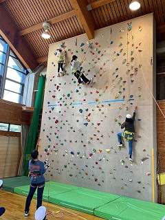 次にクライミングにチャレンジしています。綱の補助はありますが,相当高いところまで上っていきます。今度は一つ一つホールドの位置を確かめながら,慎重にゆっくり上っていきます。上りきったときには,達成したのと,ホッとしたのとが入り混じった表情をしていました。