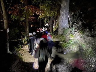 5年生がナイトハイクに出発しました。とても暗いので,懐中電灯の明かりを頼りに,恐る恐る歩いています。なかなか進めない子にはグループで声をかけ合いながら進んでいます。