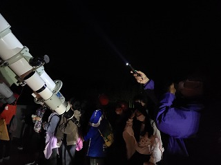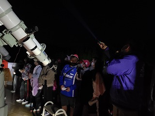 6年生は夜の活動「天体観測」をしています。今日は天気も良かったので,たくさんの星を見ることができました。そして巨大な望遠鏡で,めったに見られない星々を見ました。