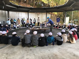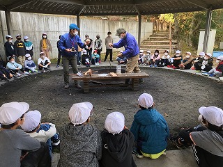 野外炊事に向けて「火おこし」をします。みんな真剣に説明を聞いています。