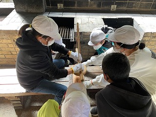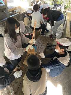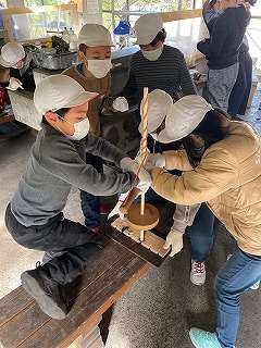 どのグループも交代しながら火おこし器を動かしています。動かしていない子も掛け声をかけ,リズムよく回せるように支援します。協力している姿が素敵です。