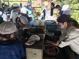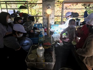 5年生の野外炊事,おかず係の様子です。家庭科の調理実習の経験を生かして,みんな自分の役割を手際よく進めていきます。声をかけ合い,めあての「協力」はできています。