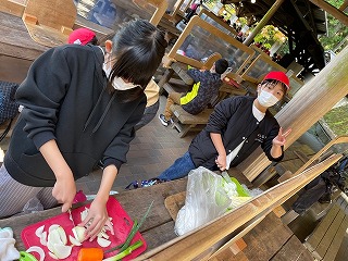 おかず係が野菜を切っていきます。家庭科での学習が生かされ,みんな包丁をきちんと扱って,丁寧に切っています。
