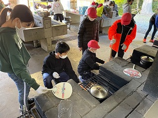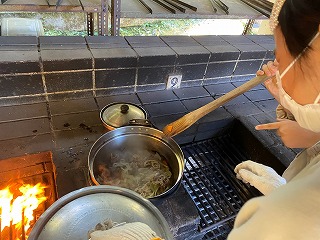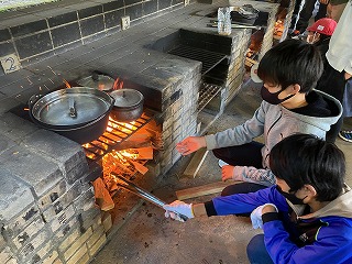 火の係の頑張りで,かまどに火がつきました。おかず係の用意したすき焼き風煮の鍋,ごはん係の用意した飯ごうをのせ,煮込み,炊いています。班のみんなで見守っている姿は素敵です。きっとおいしいご飯ができると思います。